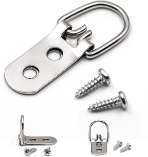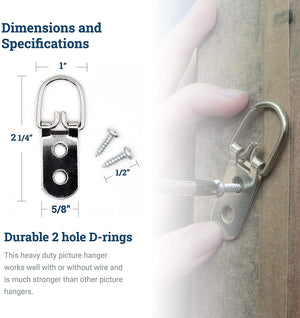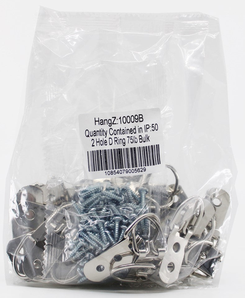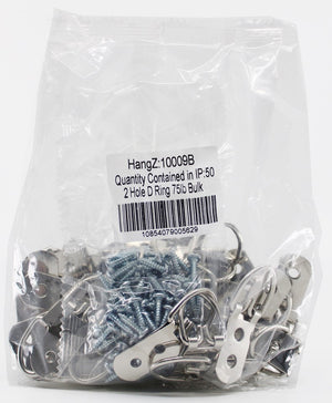 The HangZ™ 75lb 2 Hole D Ring Hanger is a durable and sturdy hanging hardware designed for frames, mirrors, and canvas. It is specifically recommended for use on wood frames that do not already have hanging hardware installed.