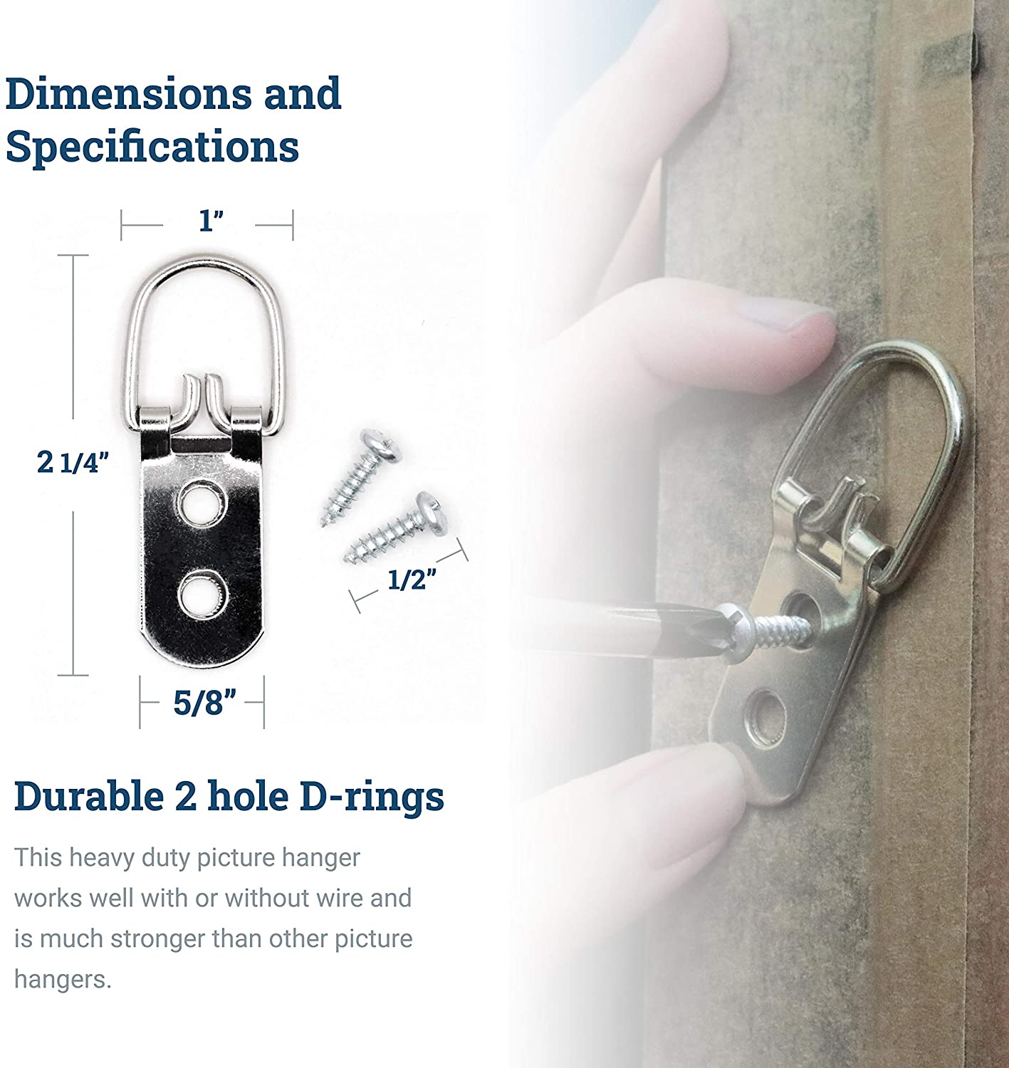 With a weight capacity of 75 pounds, the 2 Hole D Ring Hanger provides robust support for your heavy frames, mirrors, or canvases. It offers a secure and reliable hanging solution, ensuring that your items stay safely mounted on the wall.