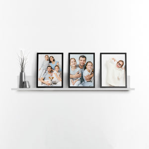 The No Stud Photo Ledge is available in various sizes, ranging from 12 inches to 48 inches, and comes in both black and white powder coat finishes. This sleek and modern ledge is designed for displaying your favorite photos and artwork without the need for wall studs.