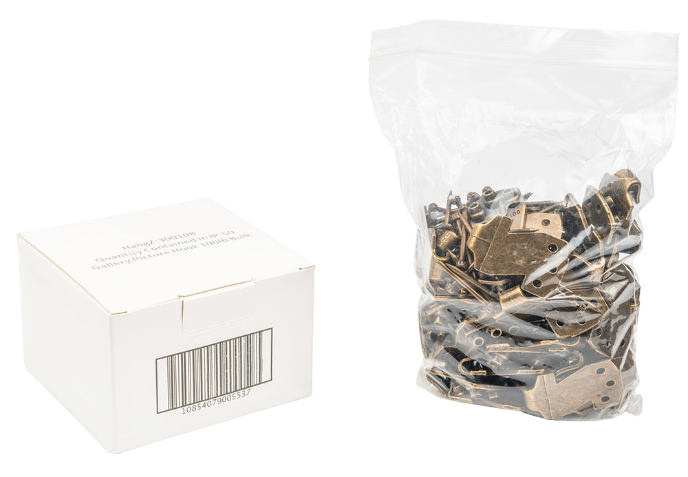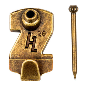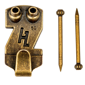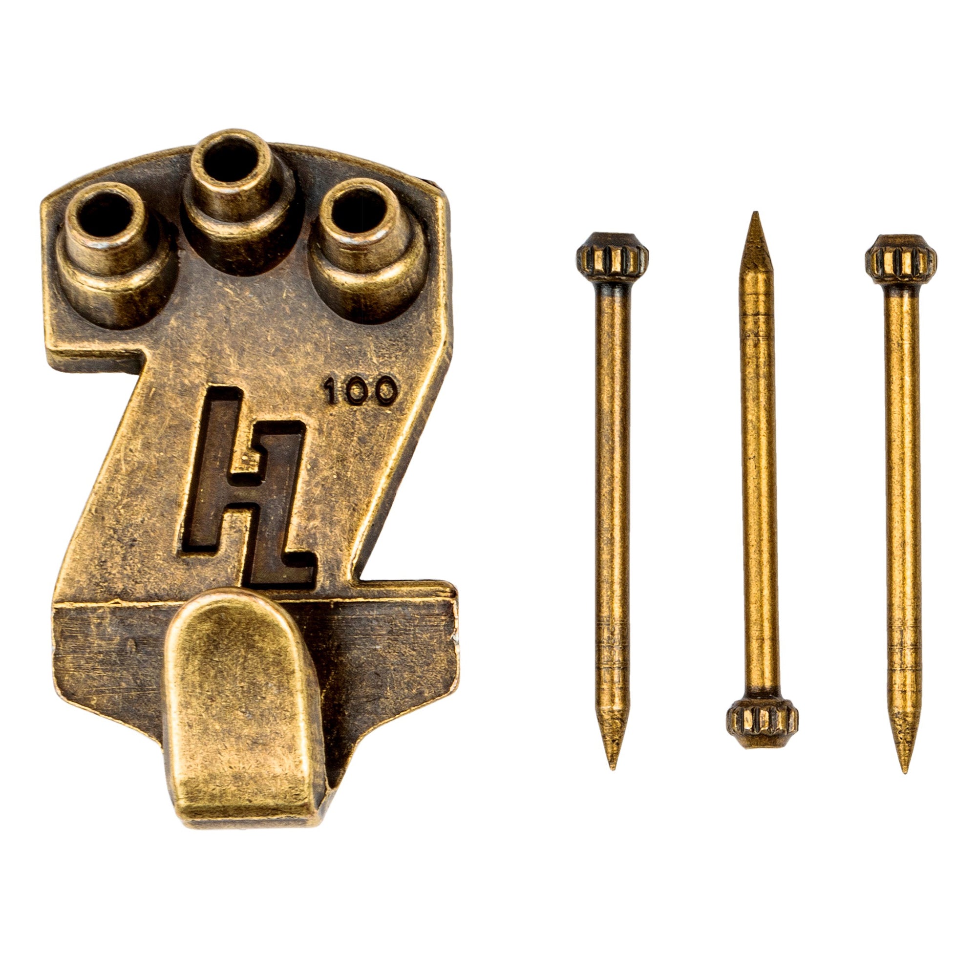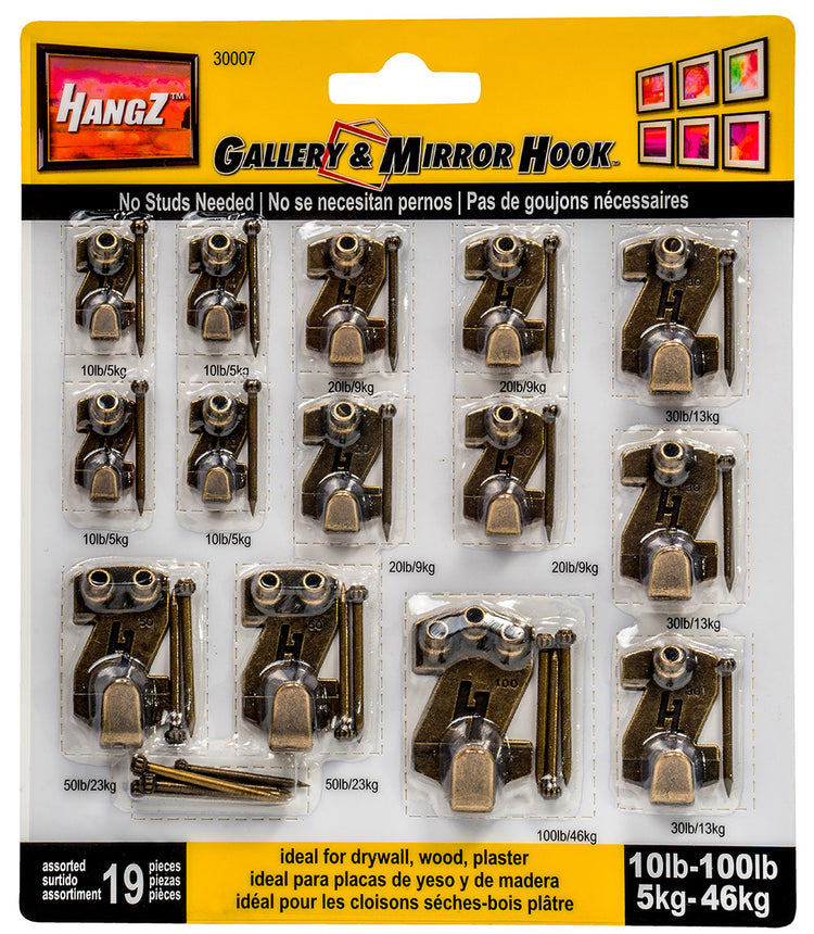HangZ™ Gallery (19-Pack) 10lb-50lb & 10lb-100lb. Picture Hooks are the professional's choice when hanging lite or heavy pictures, mirrors & canvas. The one piece Zinc Alloy construction makes the hooks the world's strongest. The precision channels make it so you don’t need anchors or to hit a stud. It's great for use with sheetrock and plaster walls. Precision channel assures that the nail enters at the perfect 45° angle Holds from 10 lbs. - 100 lbs. Zinc alloy construction making HangZ the world strongest picture hooks.
