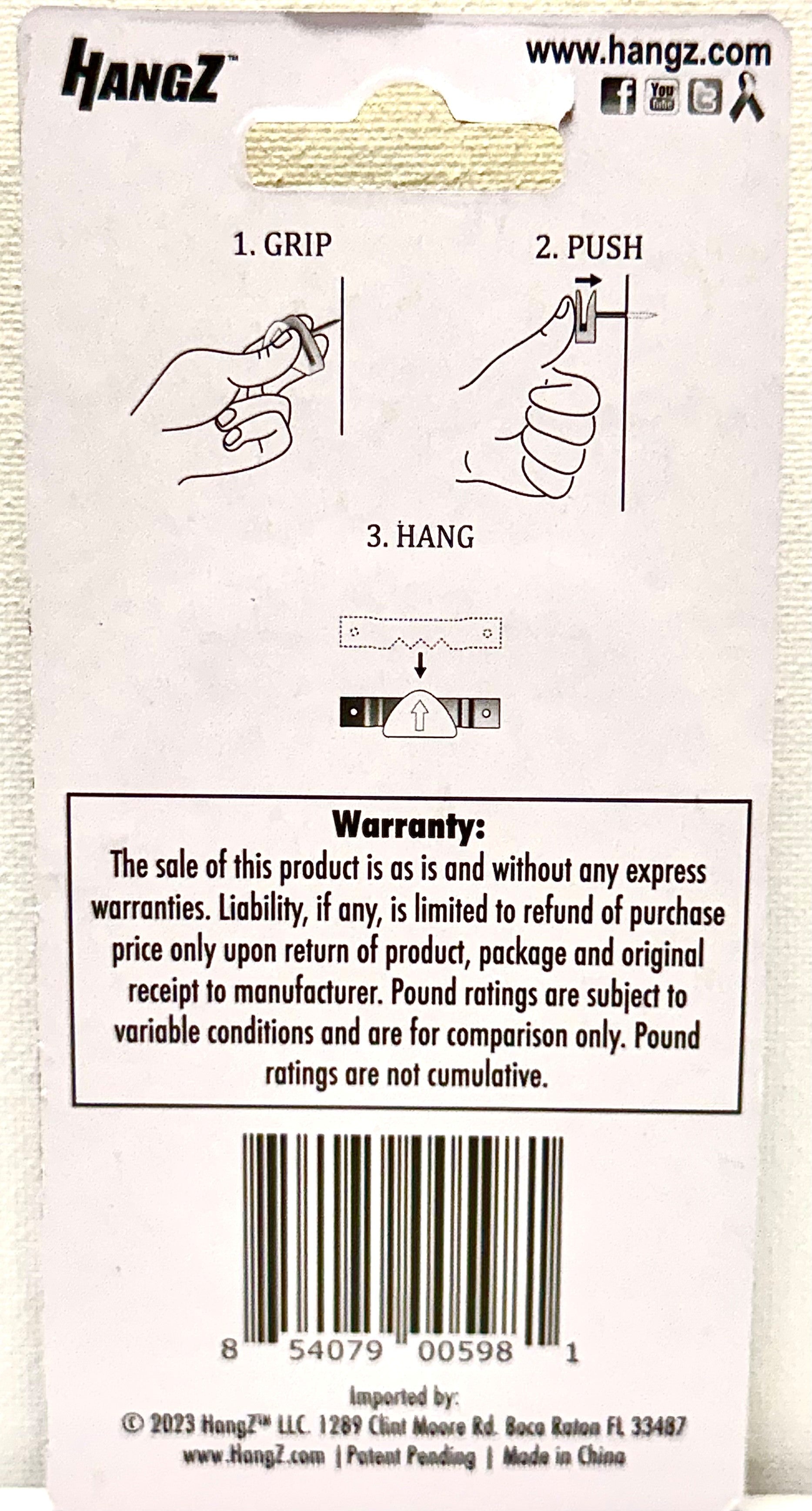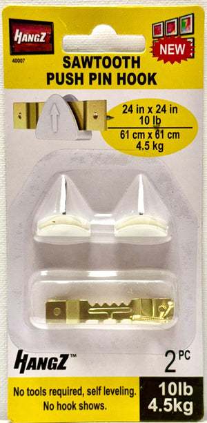 HangZ™10lb Sawtooth Push Pin Hooks 40007, 40007B – a convenient solution for hanging frames equipped with sawtooth hangers on the back. With no visible hardware, this push pin can be effortlessly installed without the need for any tools; just a simple press of the thumb does the trick. Capable of supporting up to 10lbs, it ensures your frames stay securely mounted. For optimal results, it is recommended to use them in conjunction with HangZ Sawtooth Hanger models 20003, 20003B, 20002, 20002B